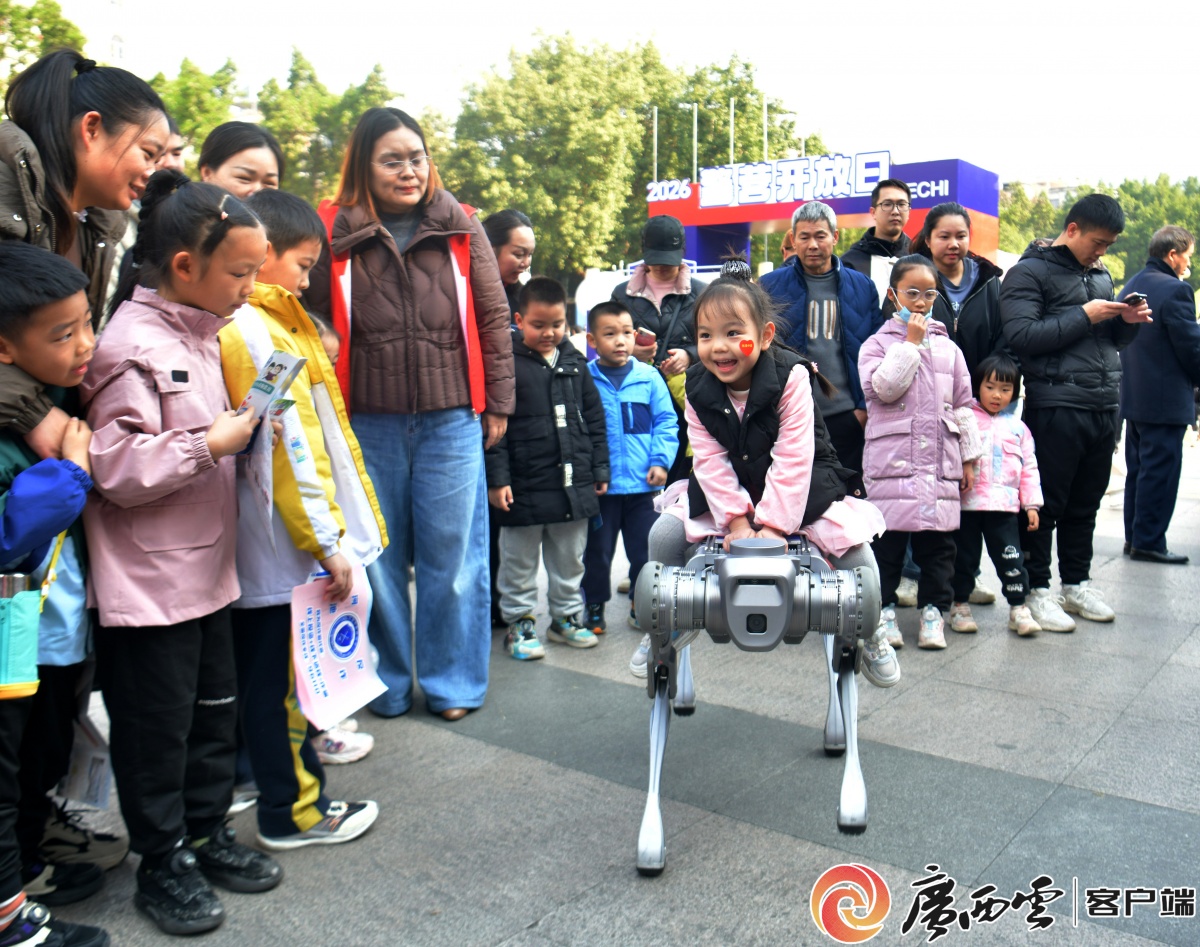 在AI智能展区前,人们排起长队。下蹲、站起、前后移动,5岁半的刘懿萱坐在警用机器狗上,脸蛋兴奋得通红:“好玩!我还想再骑一次!”